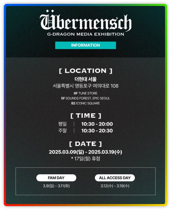 - 장소: 더현대 서울 전시회 ‘G-DRAGON Media Exhibition : Übermensch’