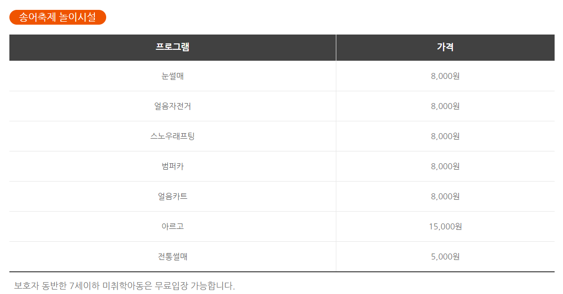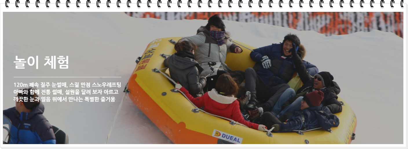 - 스노우래프팅: 눈 위에서 빠르게 질주하는 스릴 넘치는 체험으로, 짜릿한 재미를 느낄 수 있는 인기 프로그램입니다.