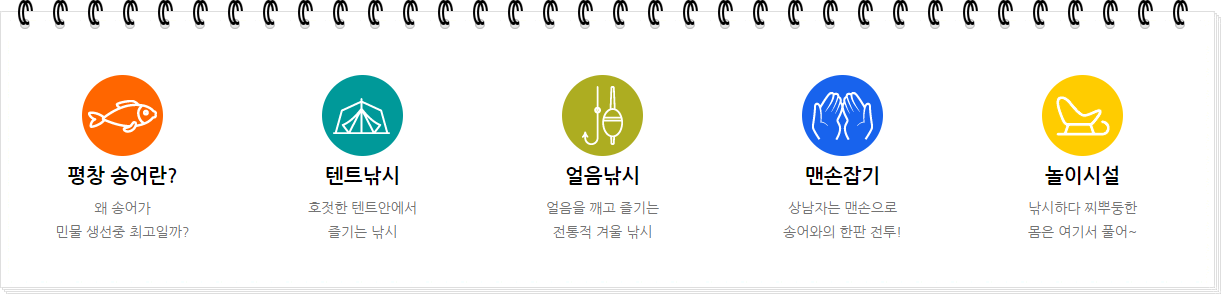 - 얼음낚시 체험: 얼음 구멍을 뚫고 직접 송어를 낚아보는 체험으로, 모든 연령대가 함께 즐길 수 있습니다. 특별히 제공되는 텐트낚시는 추운 날씨에도 쾌적하게 낚시를 즐길 수 있는 옵션입니다.