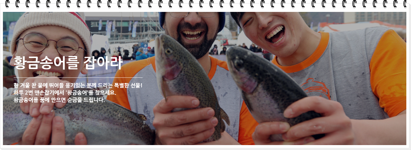 - 황금송어맨손잡기: 맨손으로 황금송어를 잡아보는 특별한 이벤트로, 어린아이부터 성인까지 모두 즐길 수 있습니다. 황금송어를 잡으면 추가적인 상품을 받을 수 있습니다.
