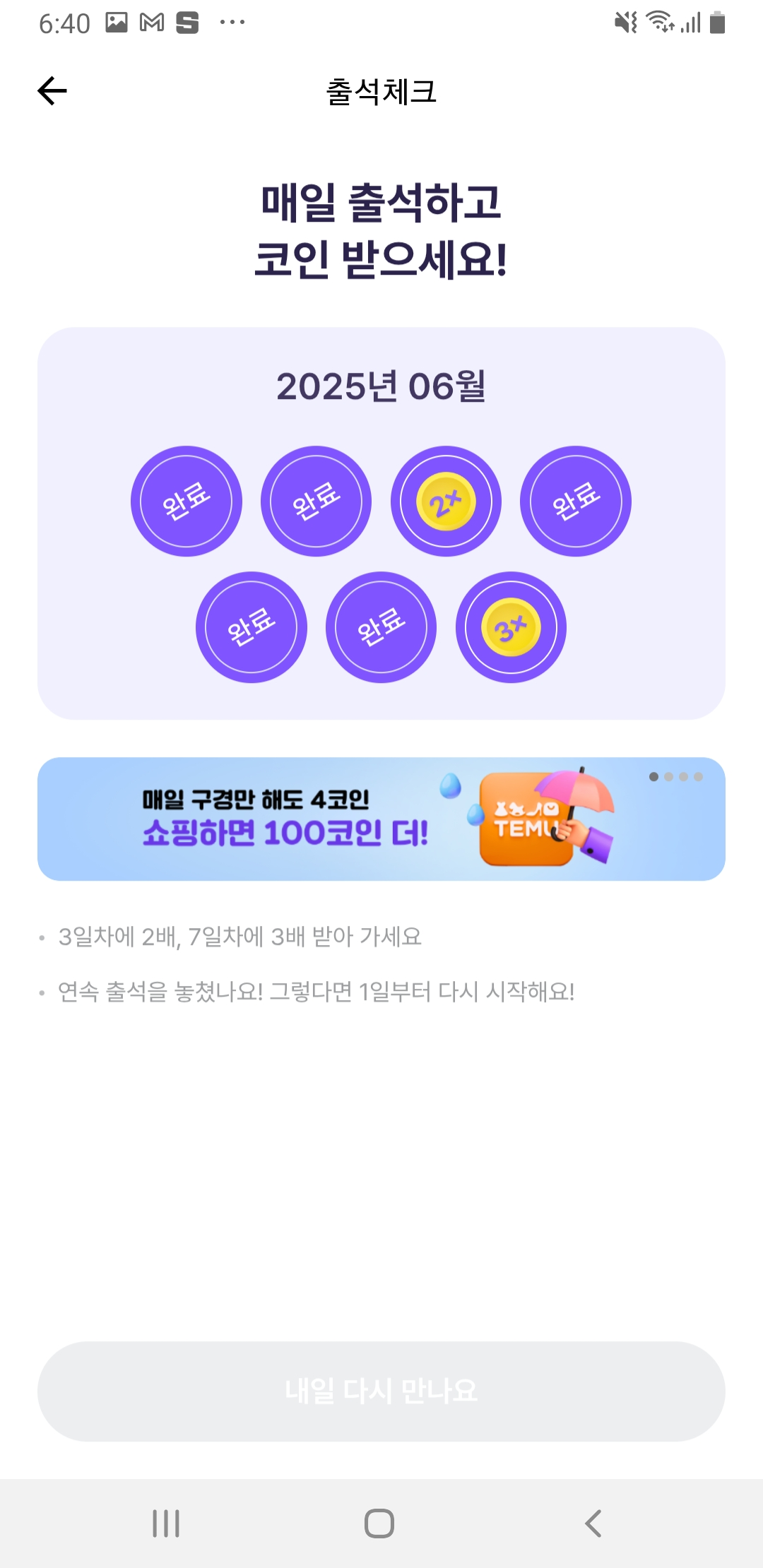 - 연속 출석 시 곱배기 보너스 포인트도 지급돼요!