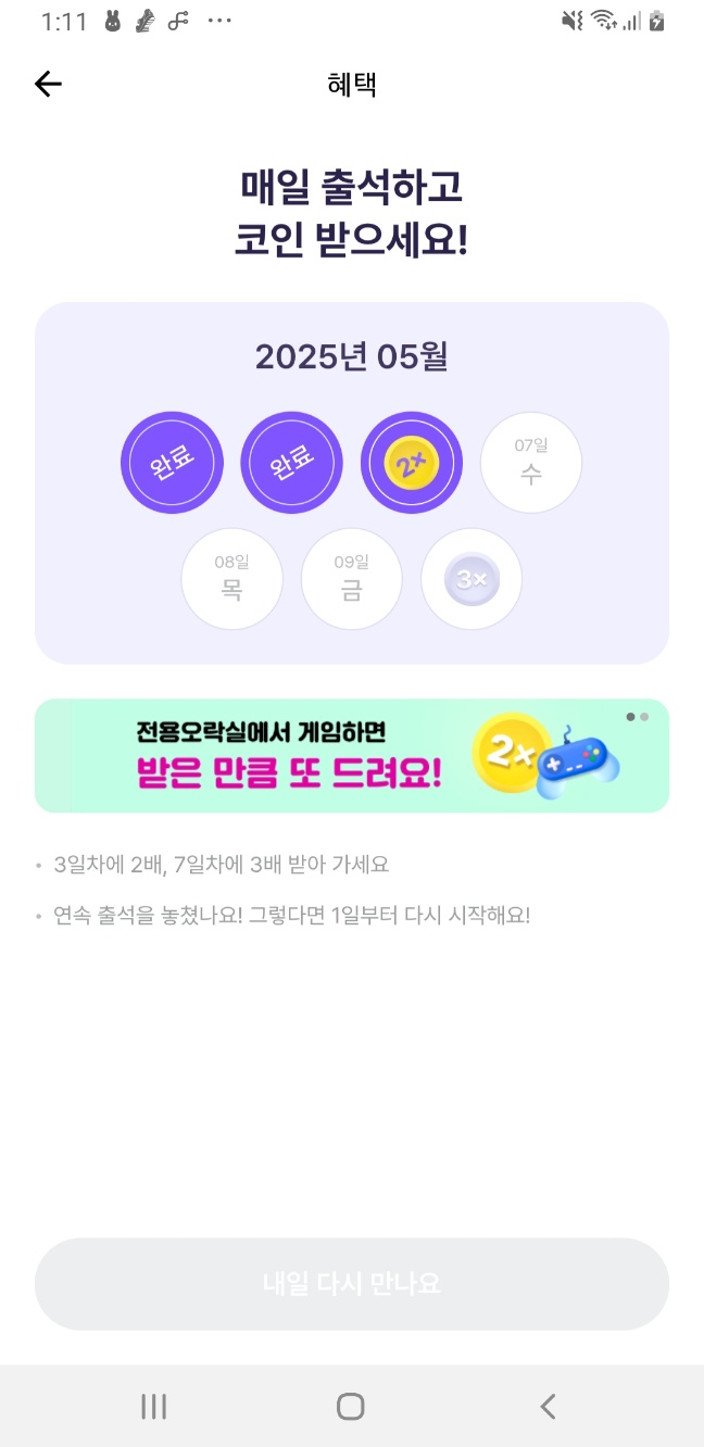 - 연속 출석 시 랜덤 곱배기 보너스 포인트까지!