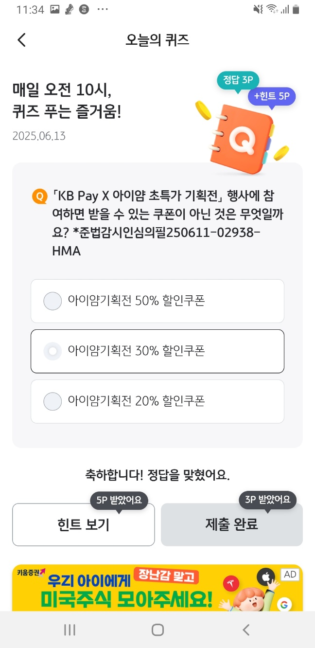 정답 시 3포인트 즉시 지급, 힌트만 봐도 5포인트 적립!
