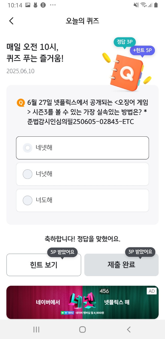 정답을 맞히면 3포인트 즉시 지급, 힌트만 봐도 5포인트 추가 지급!