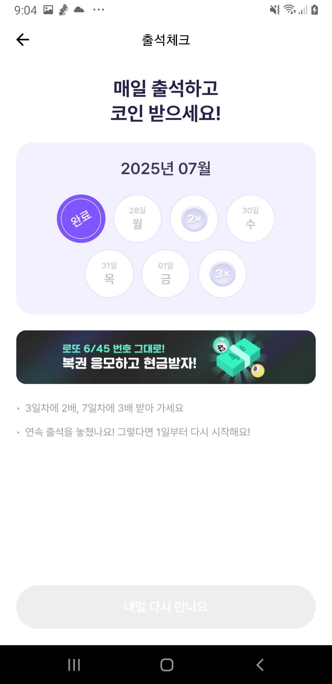 - 연속 출석 시 랜덤 곱배기 보너스도 지급!