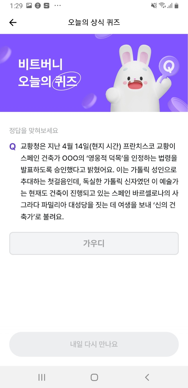 비트버니 앱의 ‘오늘의 상식 퀴즈’ 메뉴에 접속해 정답을 입력하면 포인트가 적립됩니다!