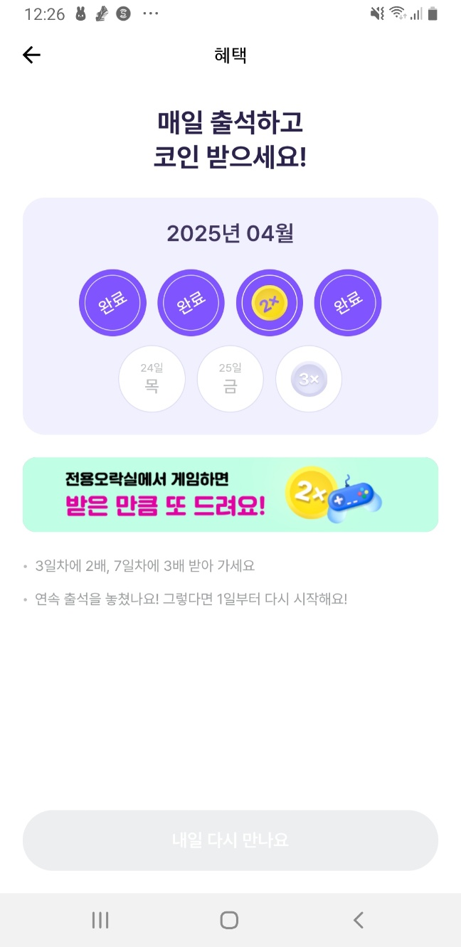 - 연속 출석 시 랜덤 곱배기 보너스까지! 🎁