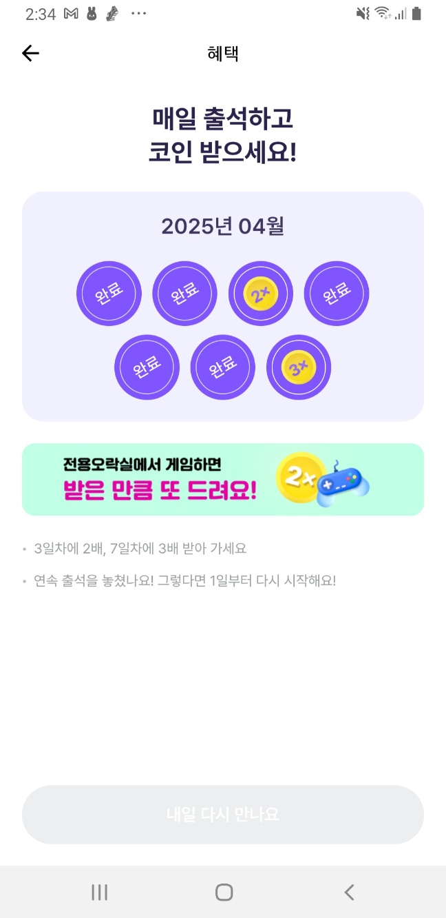 - 연속 출석 시 랜덤 곱배기 보너스도 받을 수 있어요!