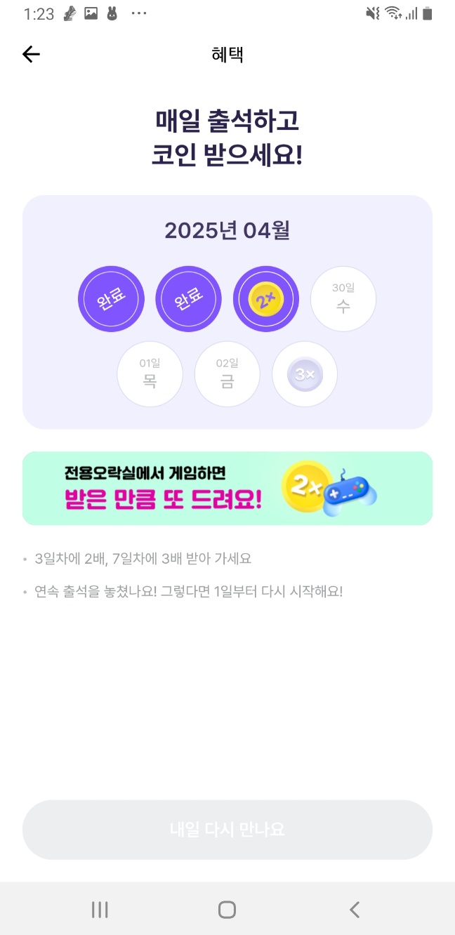 - 연속 출석 시 랜덤 곱배기 보너스 가능! 🎁