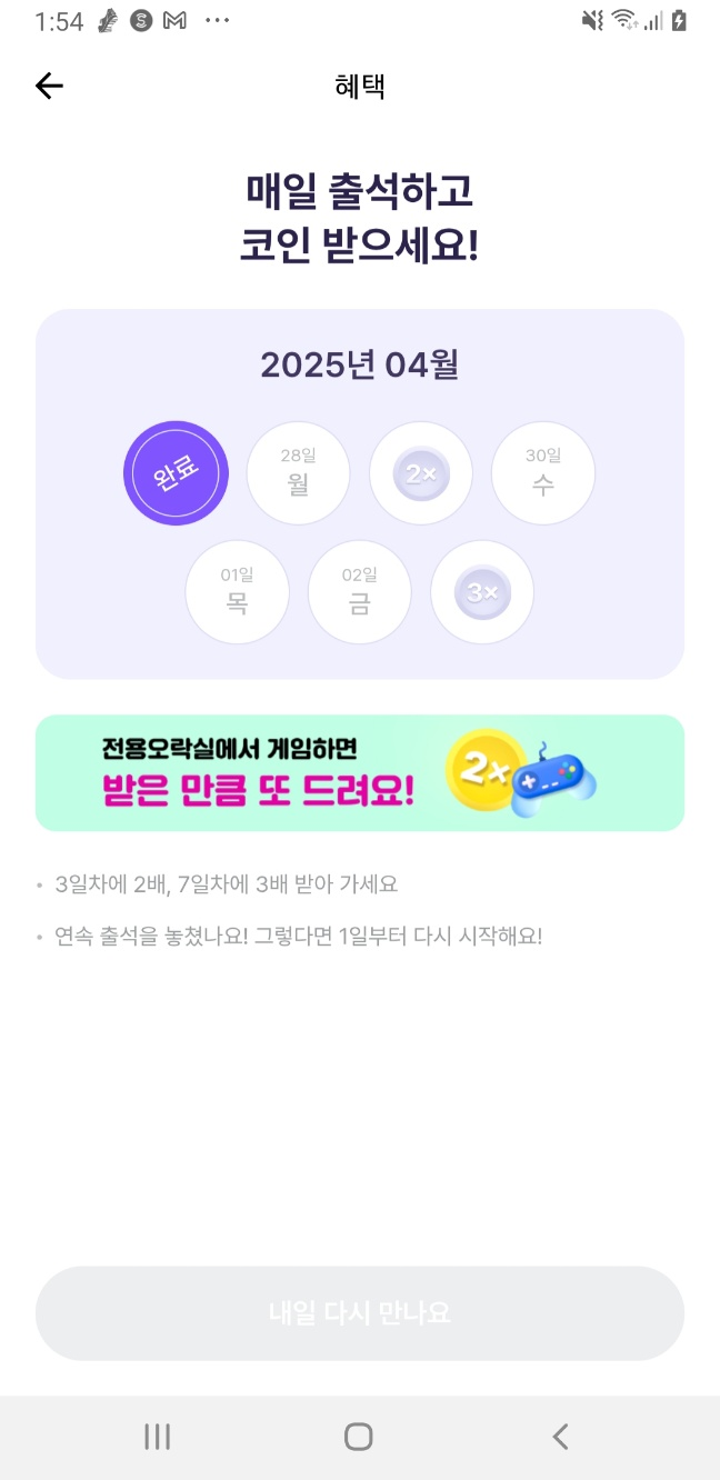 - 연속 출석 시 랜덤 곱배기 보너스까지!