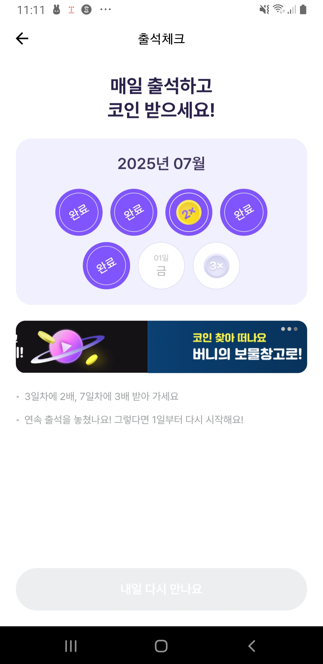- 연속 출석 시 랜덤 곱배기 보너스까지 받을 수 있어요!