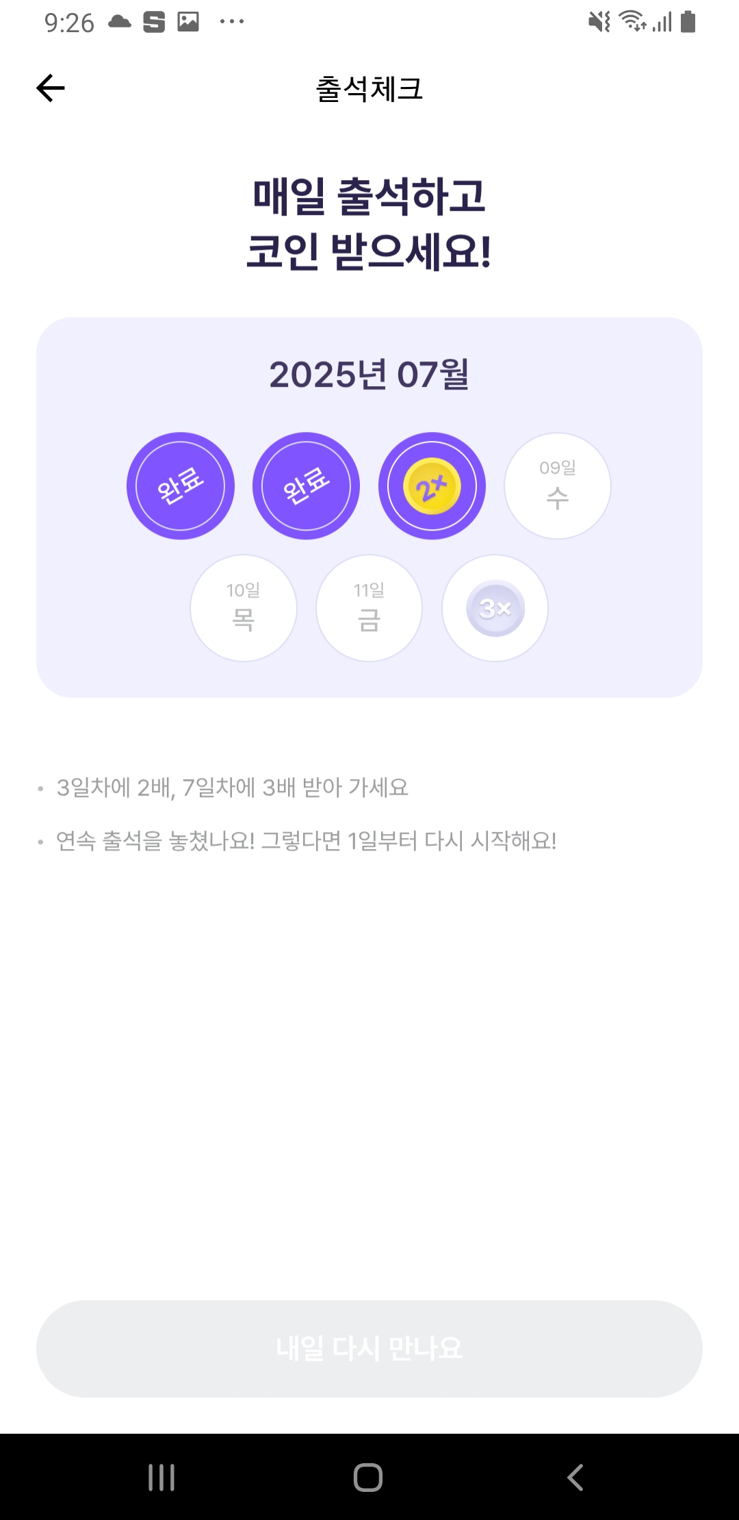 - 연속 출석 시 랜덤 곱배기 보너스도 팡팡!