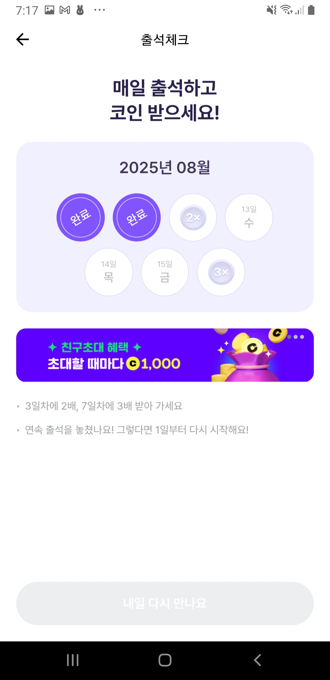 - 연속 출석 시 랜덤 곱배기 보너스도 지급!
