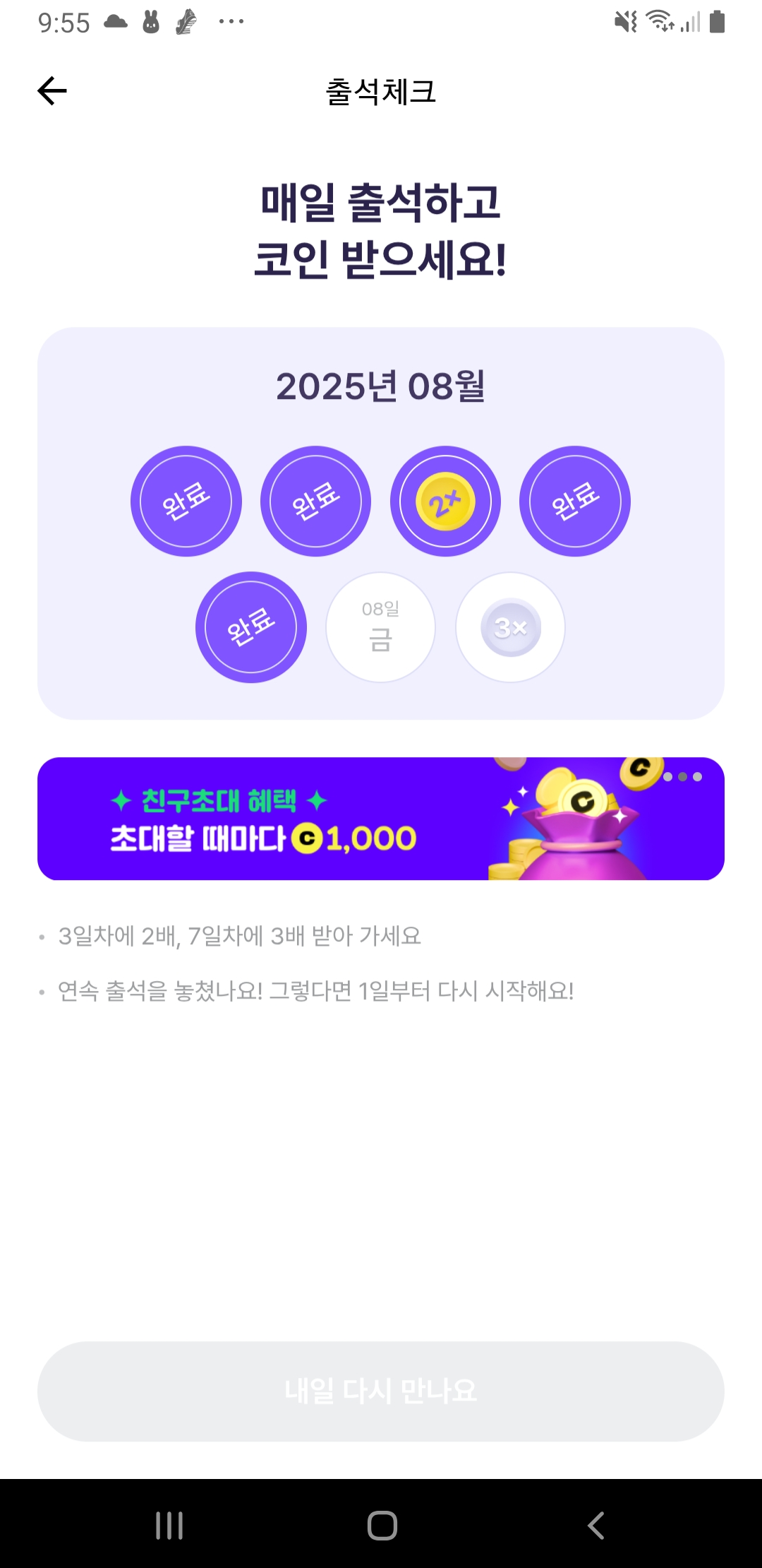 - 연속 출석 시에는 곱배기 보너스까지 지급!