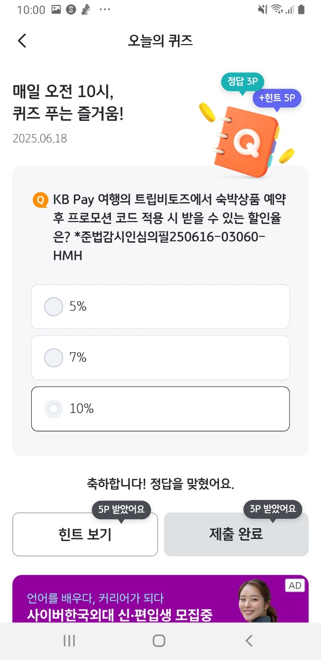 - KB Pay 앱 접속 → ‘오늘의 퀴즈’ 메뉴 클릭
