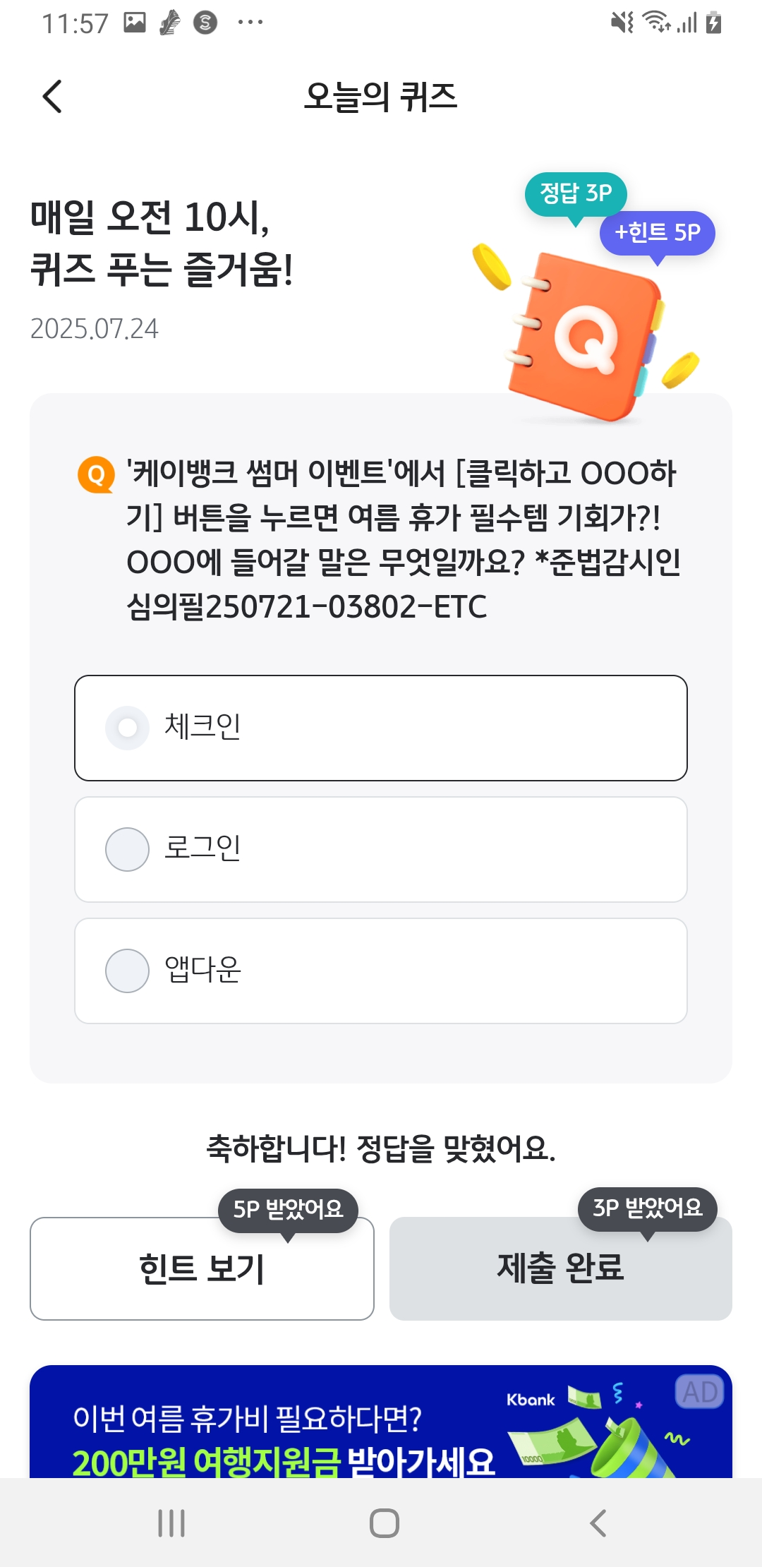 ‘케이뱅크 썸머 이벤트’에서는 ‘클릭하고 체크인하기’ 버튼을 눌러야 여름 휴가템 이벤트에 응모가 가능합니다.