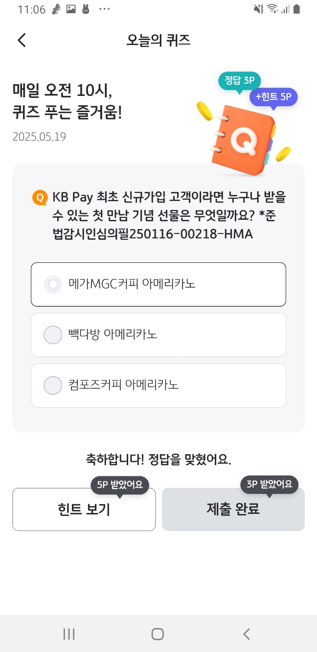 → 정답 제출 시 즉시 3P 적립! - 힌트만 봐도 5P 추가 적립!