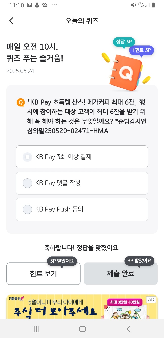 - KB Pay 앱 접속 → ‘오늘의 퀴즈’ 참여
