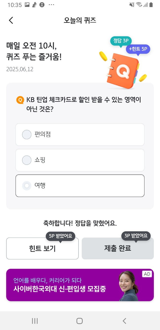 정답 시 3P 즉시 적립, 힌트 보기만 해도 5P 지급!