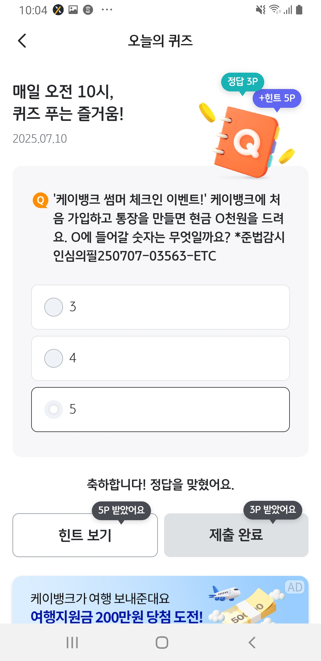 ‘케이뱅크 썸머 체크인 이벤트!’ 케이뱅크에 처음 가입하고 통장을 만들면 현금 O천원을 드려요. O에 들어갈 숫자는 무엇일까요?