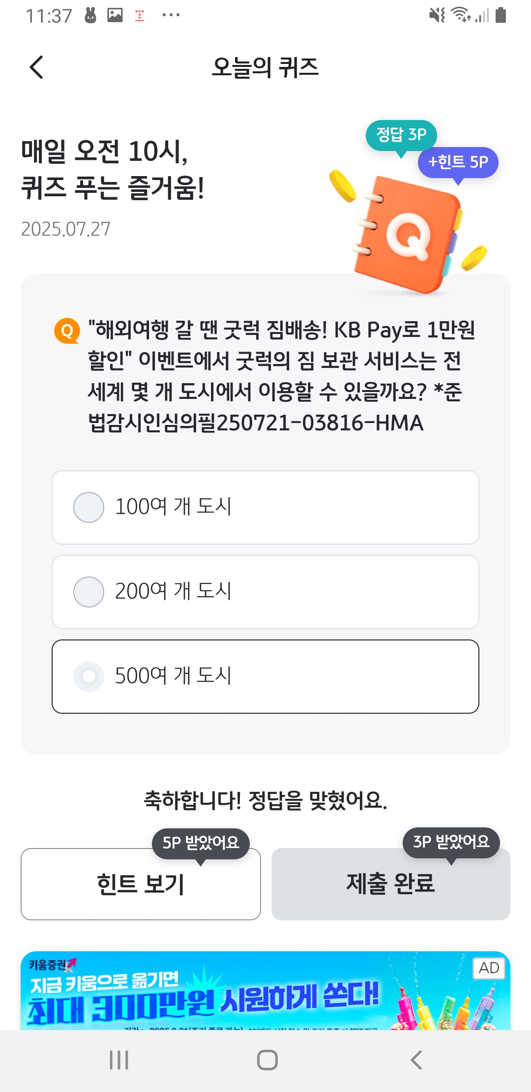 KB Pay 퀴즈로 여행 정보도 얻고,