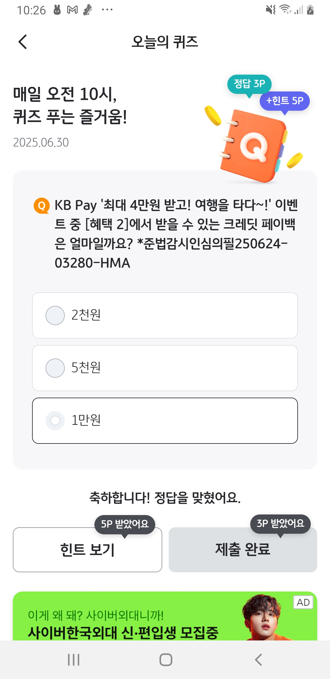 - 매일 오전 10시 KB Pay 앱 접속 → 오늘의 퀴즈 참여