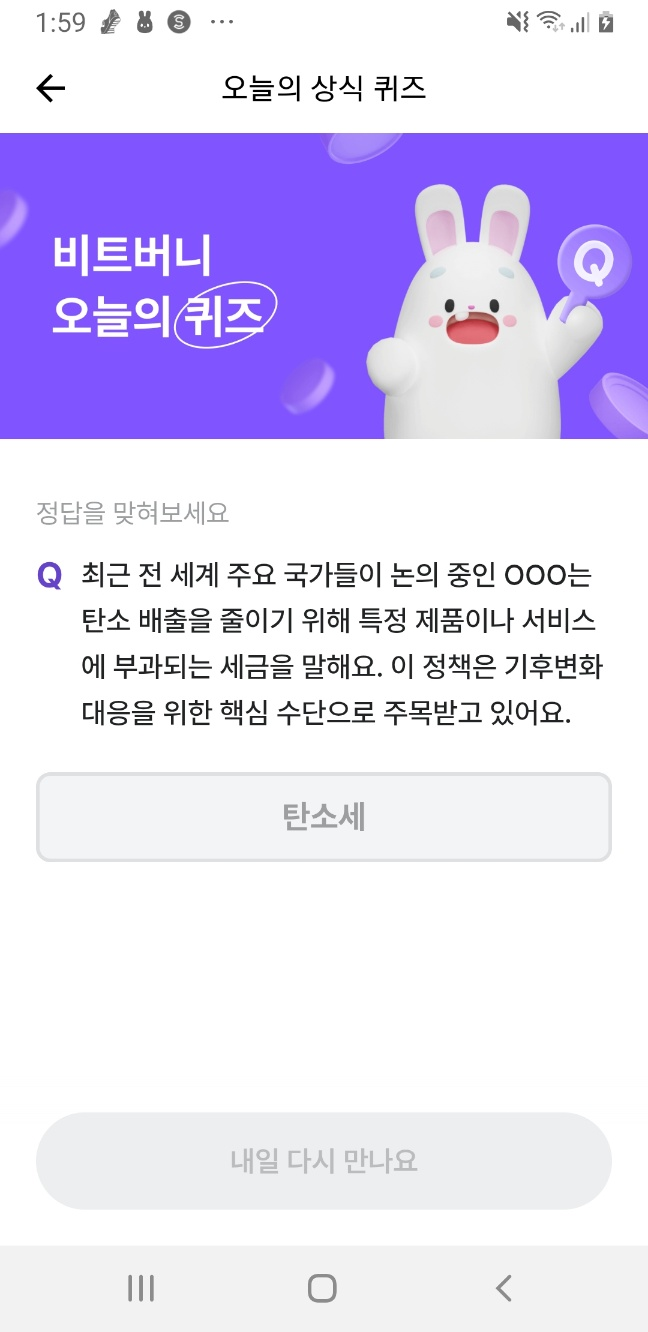 비트버니 앱에서 ‘오늘의 상식 퀴즈’ 메뉴에 접속 후 정답 입력하면 포인트 적립!