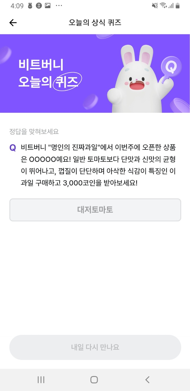비트버니 앱에서 ‘오늘의 상식 퀴즈’ 메뉴에 접속 후 정답 입력하면 포인트 적립!