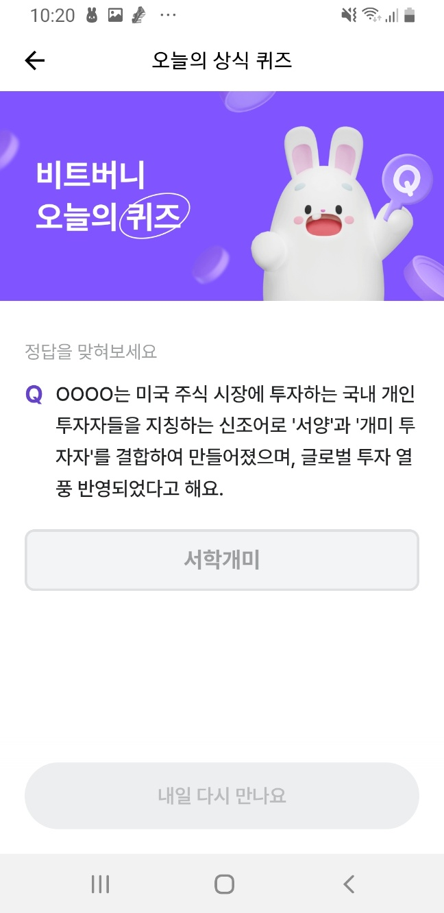 ✨ 오늘도 비트버니와 함께 퀴즈 풀며 경제 & 투자 지식도 쌓고, 포인트도 챙기세요! 🚀