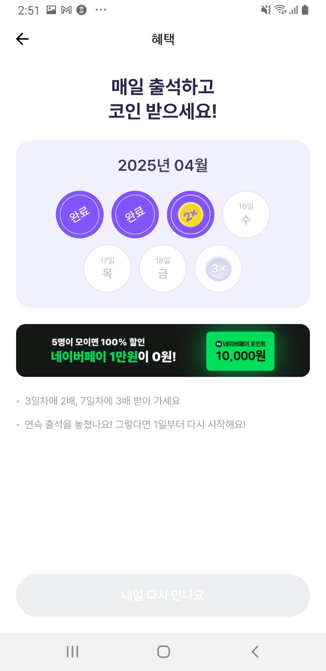 매일 기본 포인트 지급! 출석 연속 달성 시 곱배기 보너스 포인트도 팡팡!