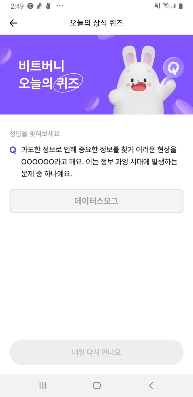 비트버니 앱 → '오늘의 상식 퀴즈' 메뉴 접속 → 정답 입력 시 포인트 자동 적립!