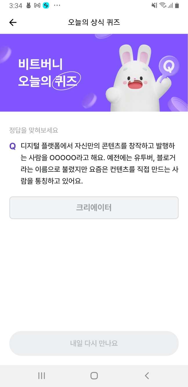 비트버니 앱에서 ‘오늘의 상식 퀴즈’ 메뉴에 접속 후 정답을 입력하면 포인트 적립 가능!