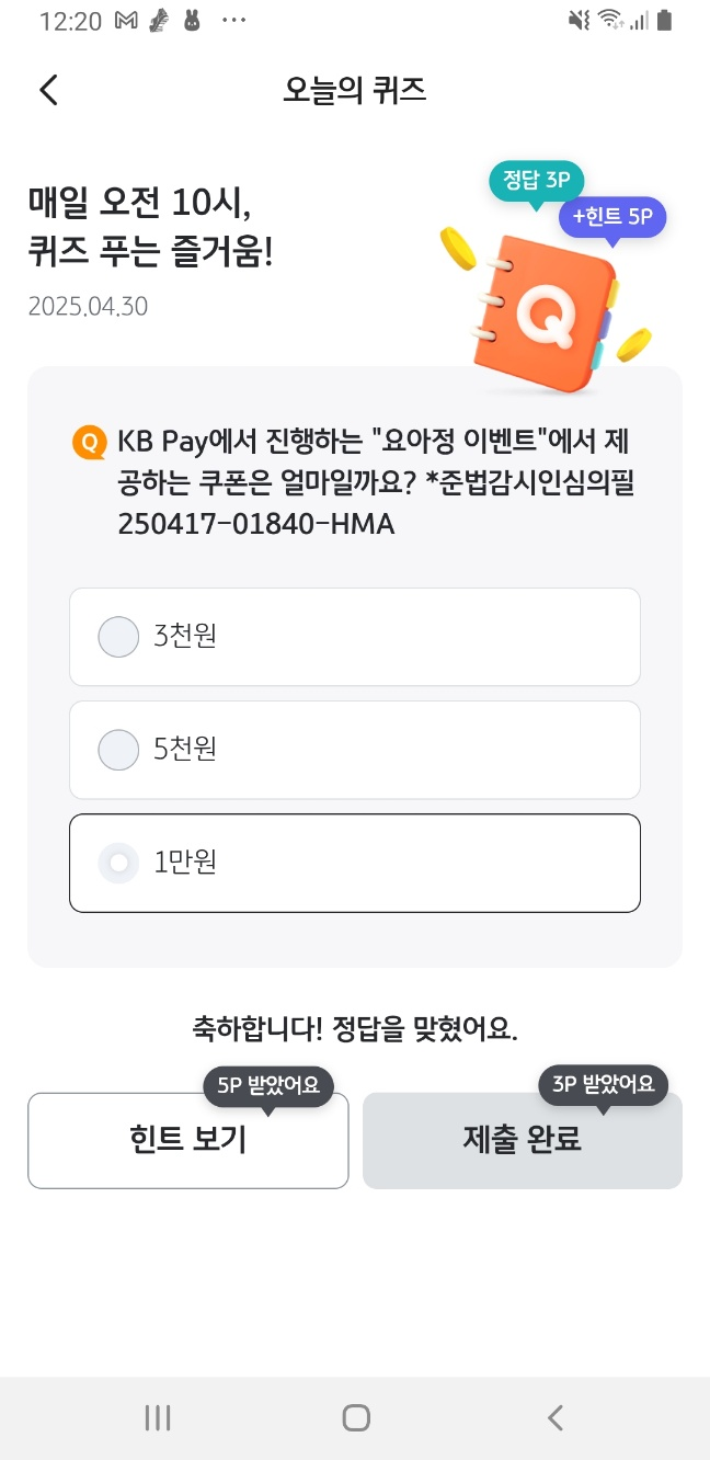 KB Pay 앱 '오늘의 퀴즈' 메뉴에서 정답 입력 시