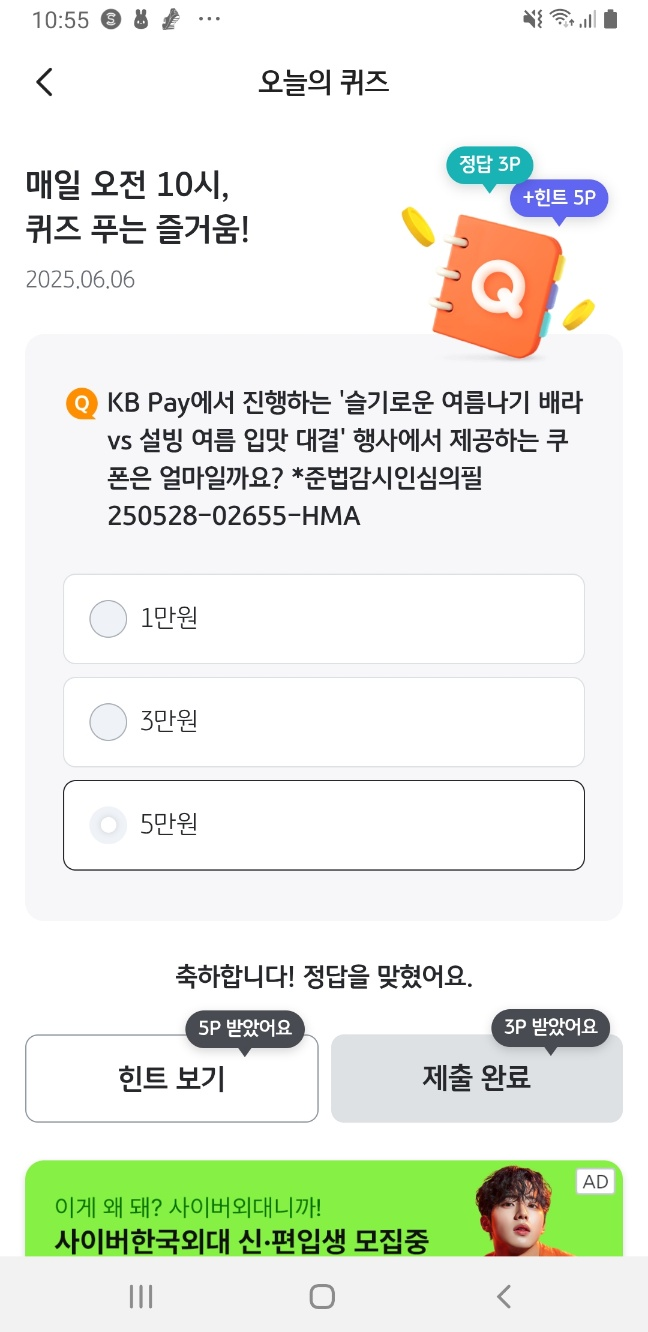 - 퀴즈 정답 맞히면 3P 즉시 적립!