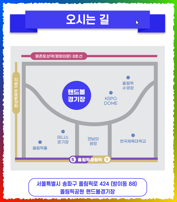 ✔️ 자가용 이용 시: 네비게이션에 '올림픽공원 핸드볼경기장' 검색