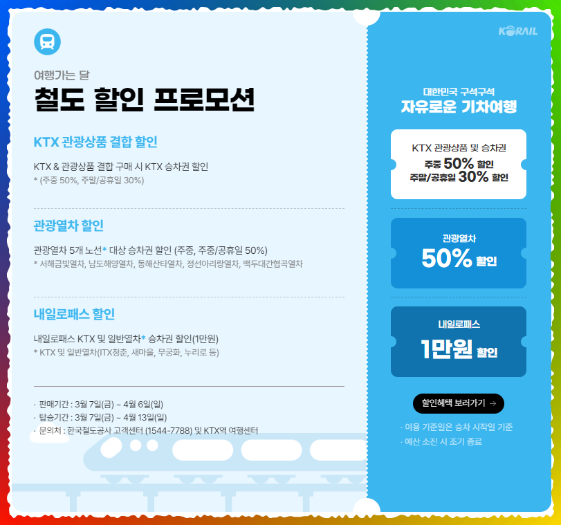 이번 프로모션을 통해 특정 구간의 KTX 여행상품을 최대 50%까지 할인된 가격에 예매할 수 있습니다.✨