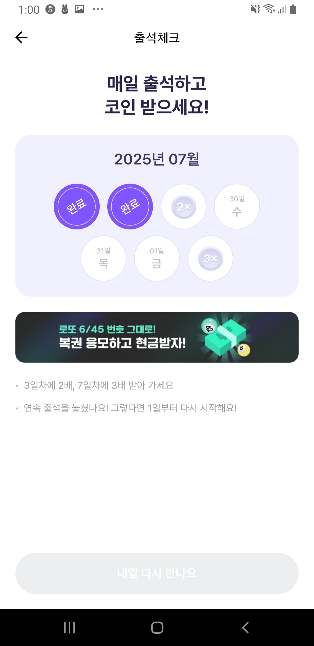 - 연속 출석 시 랜덤 곱배기 보너스까지!