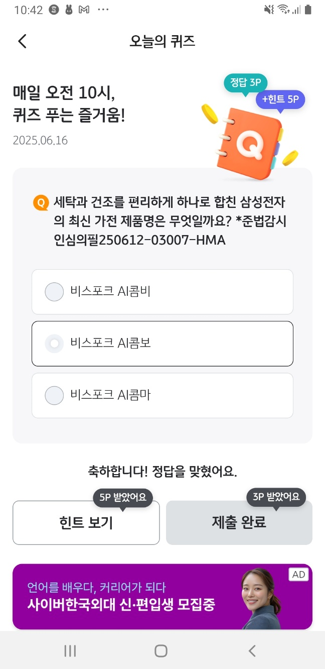 ✅ 정답 시 3포인트 즉시 적립!