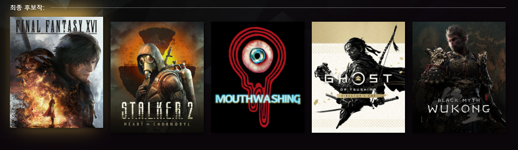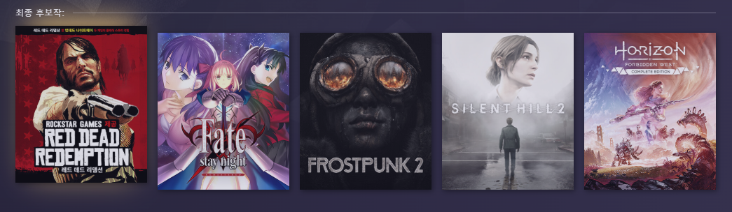 - 후보작: Fate stay night (페이트 스테이 나이트), Frostpunk 2 (프로스트펑크 2), Silent Hill 2 (사일런트 힐 2), Horizon Forbidden West: Complete Edition (호라이즌 포비든 웨스트: 컴플리트 에디션)