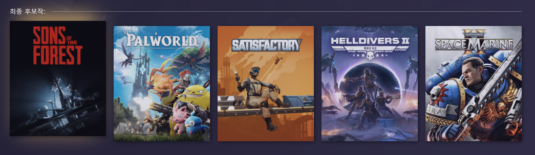 - 후보작: 숲의 아들들(Sons of the Forest), 새티스팩토리(Satisfactory), 워해머 40,000: 스페이스 마린 2(Warhammer 40,000: Space Marine 2), 팔월드(Palworld)