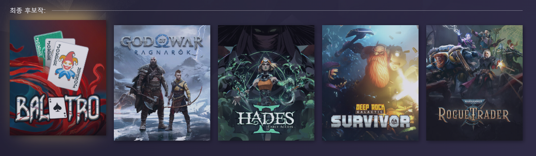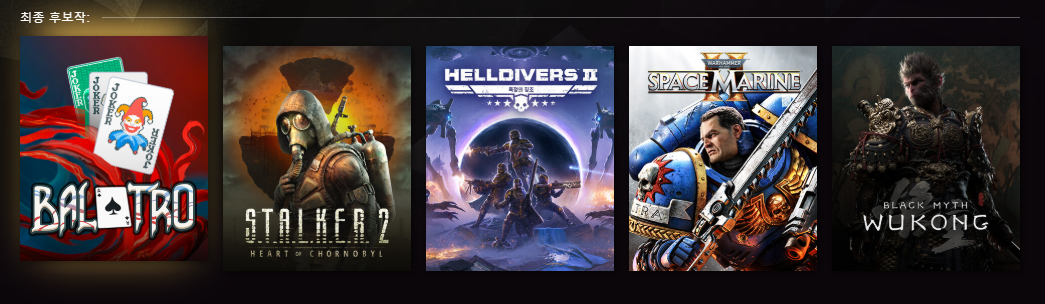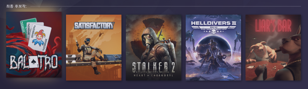 - 후보작: 발라트로(Balatro),새티스팩토리(Satisfactory) , 스토커 2: 체르노빌의 심장(STALKER 2: Heart of Chornobyl),헬다이버스 2 (Helldivers II)