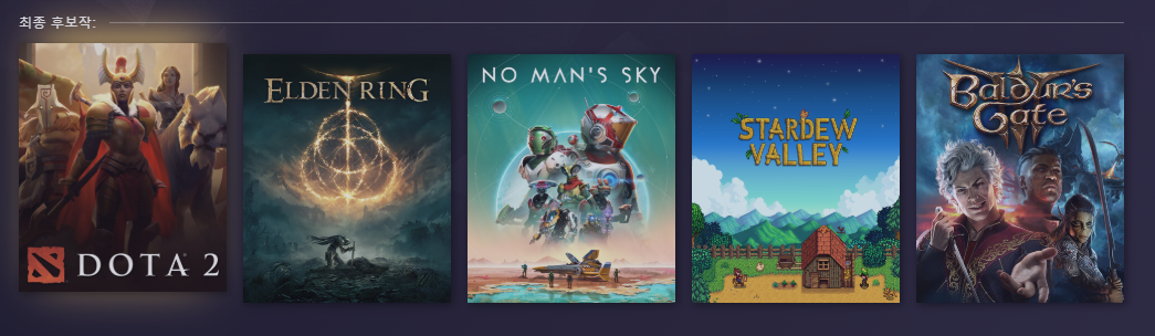 - 후보작: 스타듀 밸리(Stardew Valley), 도타 2(DOTA 2), 노 맨즈 스카이(No Man’s Sky), 발더스 게이트 3(Baldur’s Gate 3)
