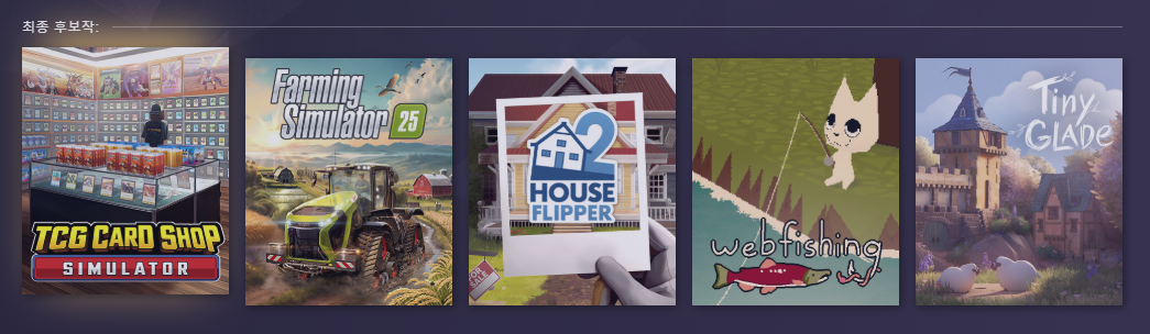 - 후보작:TCG 카드샵 시뮬레이터( TCG Card Shop Simulator ),하우스 플리퍼 2(House Flipper 2), 웹피싱(Webfishing), 타이니 글레이드(Tiny Glade)