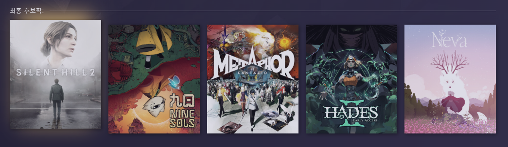 - 후보작: 나인솔즈(Nine Sols),메타포:리판타지오(Metaphor: ReFantazio), 하데스 2(Hades II),네바(Neva)