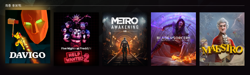 - 후보작: 마에스트로(Maestro), 블레이드 앤 소서리(Blade and Sorcery), 파이브 나이츠 앳 프레디즈: 헬프 원티드 2(Five Nights at Freddy’s: Help Wanted 2), 다비고(DAVIGO: VR vs. PC)