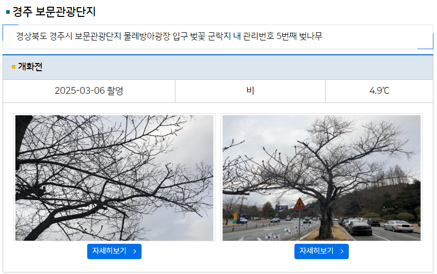 촬영 날짜, 개화 단계(개화 전 / 개화 / 만개 등), 날씨, 기온, 실사 사진까지 확인할 수 있어요!