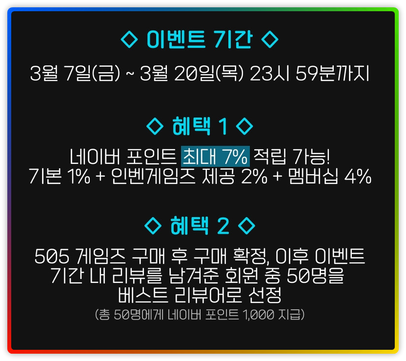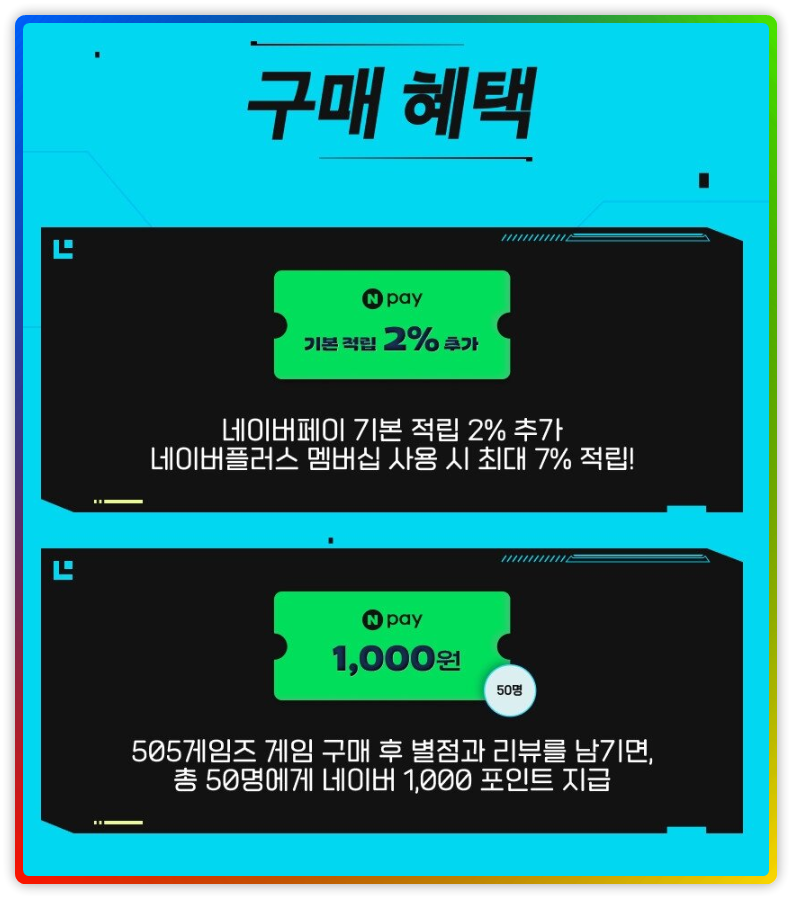 - 게임 구매 후 리뷰 작성 시 50명에게 네이버페이 1,000포인트 지급